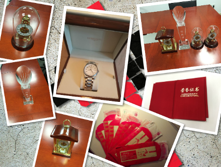 优秀员工:奖杯,奖金2000元(人);金鹰奖:奖杯,奖金6000元(人);铜鹰奖:奖杯,奖金2500元(人);准铜鹰奖:证书,奖金1000元(人);优秀团队奖:奖杯、奖金5000元(团队);五年员工贡献奖:精美钟表;十五年员工贡献奖:高档手表。